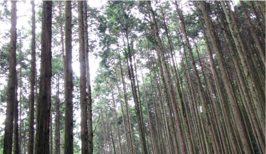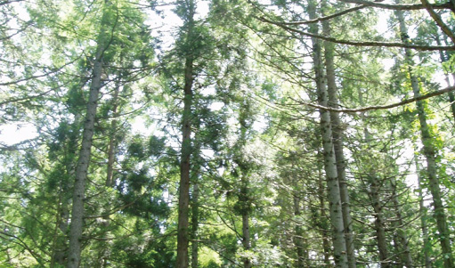 樹齢60年を超えるヒノキ林の中を歩き