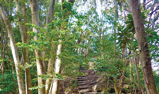 木々の緑に囲まれ、鳥の声やそよ風に枝葉が揺れる音を聞きながら森林浴をするのにとても気持ちいいコースです。コースの前半はスダジイやアカガシなどの照葉樹林、後半はヒノキ林で、二つの森を楽しむことができます。季節ごとの珍しい植物を見つけたり、植物の香りを感じたり、四季折々の楽しみも満載で、歩く度に新しい発見があるのも楽しみの一つ。また、ヒノキのウッドチップが敷かれた道もあり、お子様からご年配の方まで歩きやすいのも特徴です。是非、豊かな自然を五感で体感してみてください。お待ちしています。
