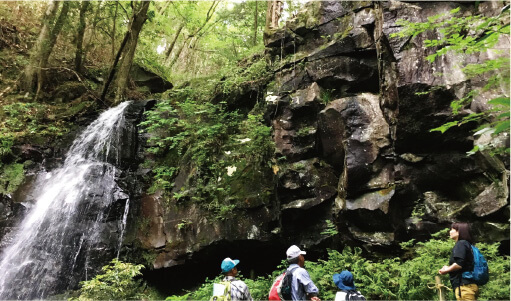 ミュンヒェン大学認定 蔵王高原坊平コースは、標高約1000mの準高地に位置し、ナラやカエデなどが茂る森を歩けば、鳥の鳴き声、風の音が聞こえ、木漏れ日が心地よく五感をくすぐります。コース最上部、蔵王山信仰の出発点だった「お清水の森」には伏流水が流れ、神聖な雰囲気の中、清冽な水が疲れを癒してくれます。壮大な自然を感じられるコースです。